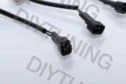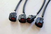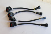 Set of four OBD2 fuel injector conversion harnesses with locking clips for Injector Dynamics ID1000, ID1050x, ID1300, and ID1700 injectors. Plug-and-play design eliminates cutting and splicing. Both connectors interface seamlessly for straightforward installation. In stock and ready to ship.